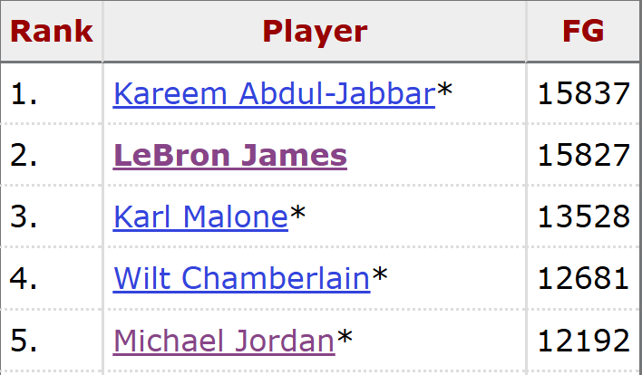 常规赛生涯至今,詹姆斯已经命中15827个球,排名历史第二,而排名第一的贾巴尔累计命中15837球,换言之,詹姆斯再进11个球就将超越天勾,成为该项数据的NBA历史第一。